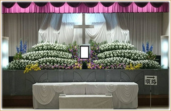 | ●花束、棺内用切花 ●寝台車(病院~自宅等) ●布団セット、ドライアイス1日分 ●式場飾り(告別式)一式 ●案内看板、写真引伸 ●献花用花(自宅用30本) ●献花用花(告別式用100本) |